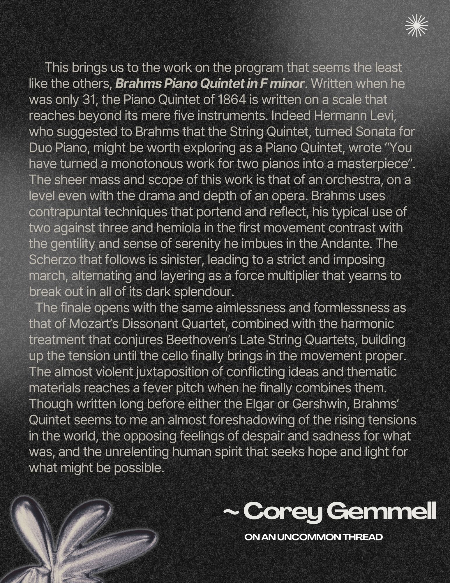 Johannes Brahms ~ Piano Quintet in F Minor, Op. 34 – the BSO Principal String Quartet with Benjamin Smith, piano